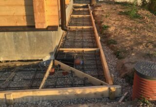 - Former le coffrage. Pour sa fabrication, une planche tranchante et des blocs de bois sont utilisés. A ce stade, il monte les bandes pour les joints de dilatation transversaux. Ils sont posés selon un angle donné. La largeur de l'élément est de 2 cm et la hauteur de la section est supérieure de 25 % à l'épaisseur de la zone aveugle. Les distances de température entre les coutures coïncident avec les distances technologiques.