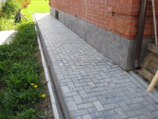 Pour la fabrication de ce type de structure, on utilise des briques de clinker, des pavés, des dalles de pavage. Avant d'installer ces matériaux, une membrane imperméable est posée sur la base. Un beau chemin est créé autour du bâtiment.