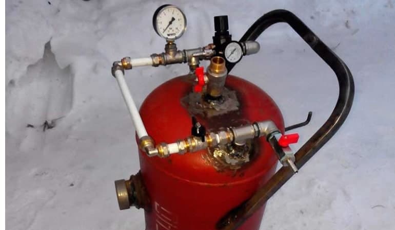 Le travail commence par la préparation des matériaux. La bouteille de gaz est vidée, la vanne est fermée et le condensat de gaz est vidangé. Ensuite, le récipient est rempli d'eau afin que le liquide déplace le gaz restant.