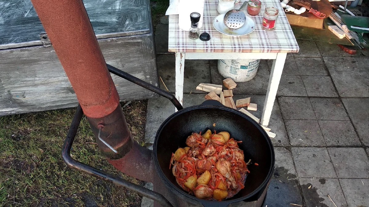 Après cela, vous pouvez commencer à cuisiner du pilaf ou d'autres aliments sur la cuisinière. Le bois de chauffage est placé le long du bord supérieur de la porte et enflammé. Lorsqu'ils sont partiellement brûlés, une chaudière peut être posée sur la structure.