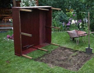 Après avoir assemblé la boîte, ils commencent à préparer la base. Pour ce faire, le terrain attribué est nivelé et nettoyé des débris. Marquez la zone en ajoutant 20 cm aux dimensions de chaque côté. Des piquets avec une corde sont enfoncés dans les coins du site, vérifiant l'exactitude des coins.