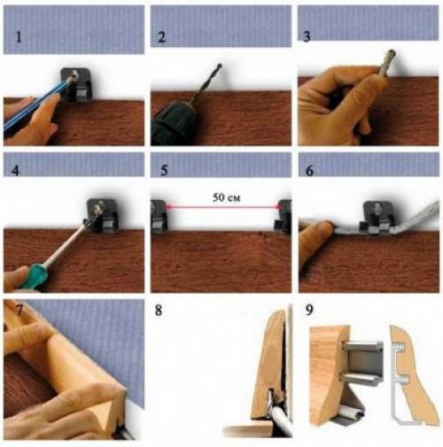 La méthode de fixation dépend du type de plinthe et de sa construction. Avant d'installer la plinthe en plastique au sol, la bande est appliquée sur le mur et des trous traversants sont pratiqués en les approfondissant de 25 mm.