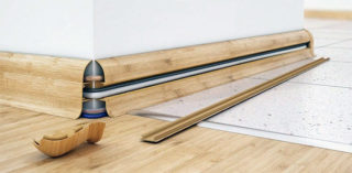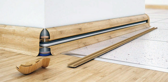 Les avantages de la charpente du sol sont qu'ils cachent les fils derrière eux, installent des éléments chauffants. Si vous fabriquez des plinthes au sol avec des attaches, elles sont démontées pour l'inspection et la réparation des câbles. Il existe des options avec un conduit de câbles externe avec un panneau longitudinal encliquetable. Des joints élastiques sont prévus sur les deux bords de la bande afin que la nervosité de la paroi ne soit pas flagrante.