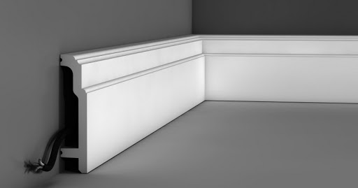 Un ruban est fabriqué à partir de PVC pour l'installation d'un socle de sol dans des pièces de forme irrégulière. Les éléments sont souples, ils peuvent encadrer des parois semi-circulaires.