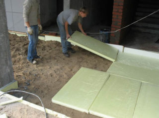 - Une couche de 15 cm d'argile expansée est coulée ou un isolant solide est posé. Utilisez un matériau tel que Penoplex ou polystyrène expansé (polystyrène) avec une densité supérieure à 25 kg/m³. Vous pouvez marcher dessus avec précaution et la force est suffisante pour résister à la masse de la chape finale.