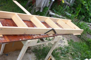 - Conformément aux dimensions des sections, les planches sont découpées en cordes d'arc. Les trous doivent être limés. Les marches sont coupées, tous les éléments sont poncés. Selon les marques marquées, des rainures sont faites avec un ciseau sous les marches. Toutes les pièces du produit sont assemblées avec des vis autotaraudeuses.