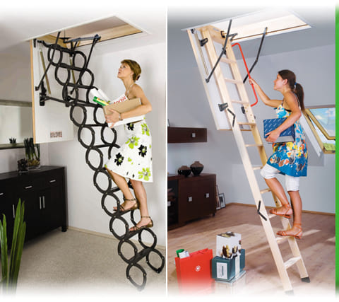 - Facile à utiliser. Tirez sur la marche inférieure de la dernière section pour la redresser au sol. Dans l'ordre inverse, l'échelle se replie sous le plafond. Vous pouvez acheter des modèles modernes équipés d'un entraînement électrique.