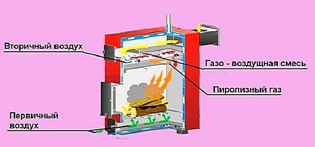 Les avantages de l'équipement sont un rendement élevé, l'absence d'automatisation complexe, l'indépendance énergétique, la sécurité par rapport aux chaudières à gaz et à combustible liquide. Les unités de pyrolyse donnent un chiffre utile de 90 %. Les fours à combustion longue affichent un résultat de 75 à 80% en raison de l'interaction du corps avec les conduites d'eau de l'échangeur de chaleur.