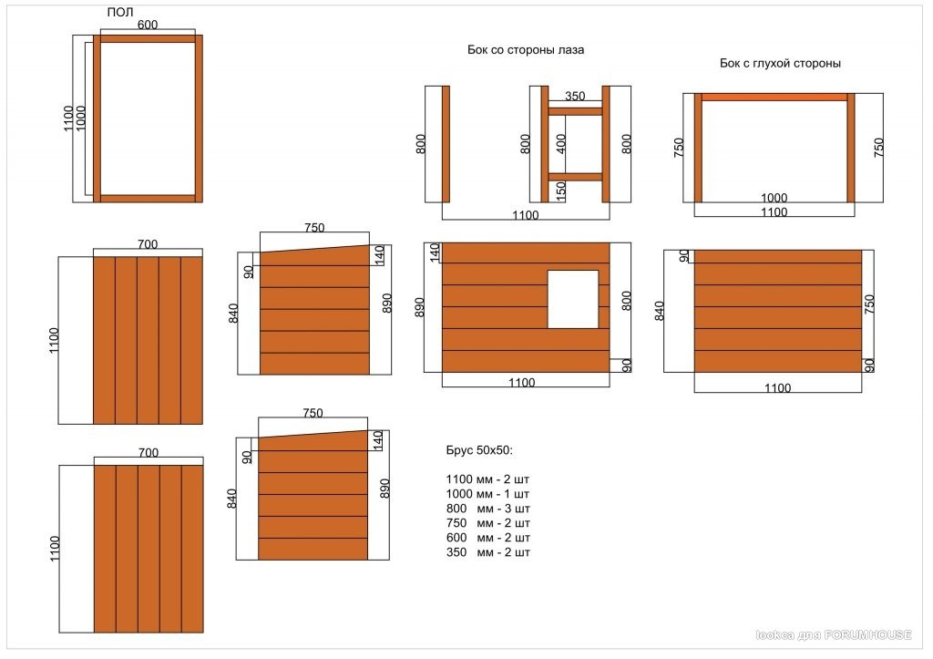 Il existe plusieurs options pour les formes : rectangle, carré, ovale. L'emplacement doit être pris en compte, car si le trou est fait trop haut ou trop bas, il sera gênant pour l'animal d'utiliser le logement. Découpez un trou au centre du mur pour empêcher les précipitations et le vent de pénétrer dans le bâtiment. Traditionnellement, l'entrée se fait plus près du plafond latéral, en supprimant un coin pour se protéger des courants d'air.