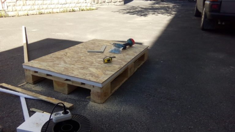 Retournez les palettes vers le bas, en les plaçant sur les rails en saillie. Remplissez l'espace entre les supports avec des planches afin d'obtenir une plate-forme plate. Fixez les feuilles de mousse ou de polystyrène sur le dessus et cousez avec du contreplaqué.