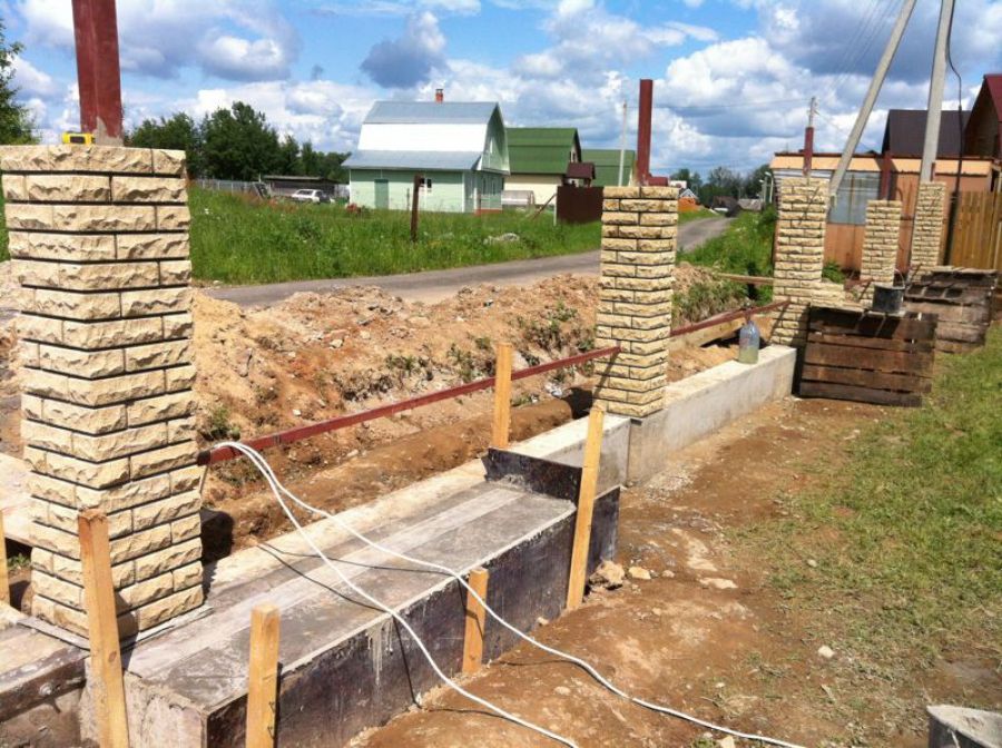 La première étape de coulée de la fondation commence par un approfondissement sous les piliers. La position verticale des tuyaux est contrôlée au moyen du niveau du bâtiment, après quoi tout le ruban est coulé.