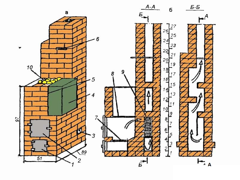 Pour construire un poêle en briques pour un bain de vos propres mains, vous devez préparer un dessin de conception. Le diagramme doit montrer ses principaux composants et leurs dimensions.
