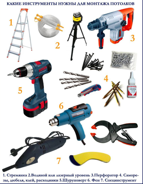 Des chevilles sont utilisées pour fixer le profil. En plus des outils, vous devez préparer tous les éléments structurels : un profilé de fixation (plastique ou aluminium), des vis autotaraudeuses ou des chevilles, une toile.