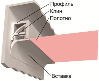 Pour réaliser un plafond tendu en utilisant la méthode du vitrage, vous avez besoin d'un profilé en aluminium en forme de U. Une parclose en bois est nécessaire, avec laquelle la toile est serrée. Le schéma de montage présenté est relativement bon marché, donc plus populaire. L'inconvénient de cette méthode est la possibilité que la parclose saute hors de la rainure. Il faut de l'expérience pour fixer fermement et correctement le film.