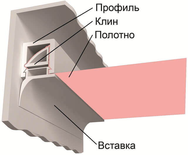 Le film étant solidement fixé au profilé, la structure est capable de supporter des charges importantes. la méthode de montage au harpon est utilisée dans les grandes pièces, les gymnases, les piscines. Lors de l'installation du plafond, aucun affaissement ne se forme.