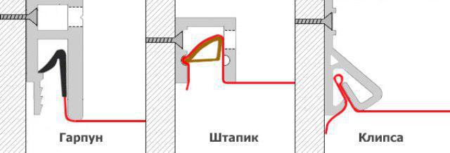 Les schémas d'installation et les méthodes de fixation d'un plafond tendu sont différents. Vous pouvez assembler la structure à l'aide d'un harpon, d'une parclose ou d'une serrure à clip. Chaque type d'attachement a ses propres caractéristiques.