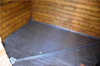 - Un film d'étanchéité est posé sur le sol rugueux préalablement préparé, qui doit également couvrir 15 à 20 cm des murs adjacents. Fixez l'imperméabilisation avec de la colle, ce qui préservera son intégrité.