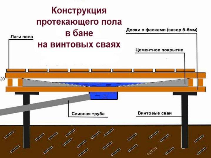 Seul le sol "sec" est isolé dans le bain, qui est structurellement un sol continu de planches ou une base monolithique de béton. Il doit avoir un drain spécial pour les eaux usées.