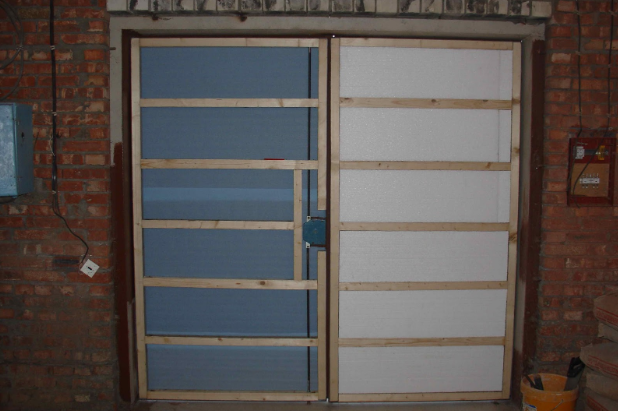 Les portes de garage sont isolées avec de la mousse de polystyrène à l'aide d'un lattage composé de lattes de bois ou d'un profilé en fer galvanisé. Les éléments sont placés le long du périmètre, en bas et en haut de sorte que les tailles des cellules coïncident avec les dimensions du panneau et n'ont pas besoin d'être coupées.