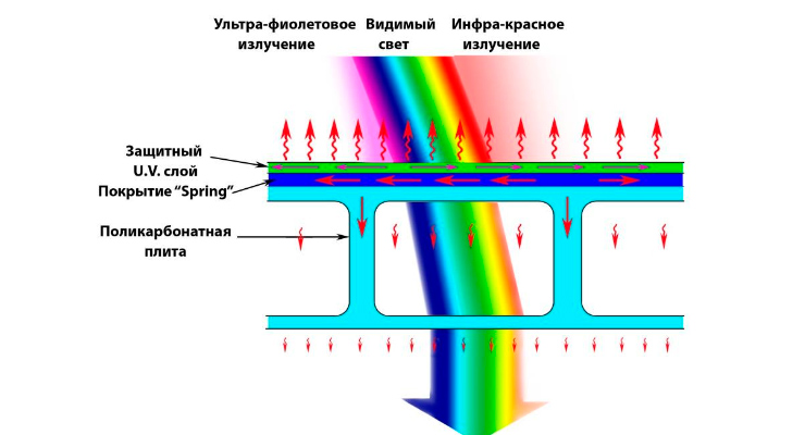 - Transmission lumineuse - paramètres de performance de 90 à 25%. Vous pouvez choisir du polycarbonate avec une excellente transmission du soleil ou une option avec un ombrage modéré (fort).