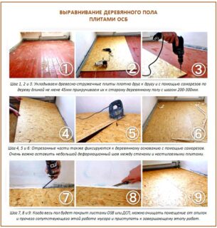 - Matériau en feuille. Il est utilisé lorsque la surface est plane, mais que le revêtement est tellement déformé que sa restauration est impossible ou économiquement peu pratique. Dans de tels cas, l'ancien revêtement de sol est utilisé comme base rugueuse, mais il est pré-renforcé afin d'exclure les chocs et les grincements ultérieurs. Des matériaux tels que les panneaux OSB, les panneaux de particules, les panneaux de particules liés au ciment et les plaques de fibres de gypse sont utilisés comme revêtements. La fixation est réalisée de manière rigide - sur de longues vis autotaraudeuses. Après avoir recouvert toute la surface, les interstices sont fermés et polis.