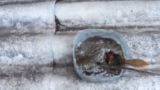 - Après avoir nettoyé la surface endommagée de la poussière et de la saleté, du mastic de bitume y est appliqué à l'aide d'un pinceau.