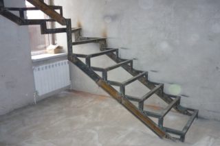Tout d'abord, un cadre métallique est créé.En le fixant, vous pouvez installer les escaliers. Si la base de la maison est en béton, les supports inférieurs des limons peuvent y être montés directement. Les filets sont constitués de coins et les kosoura sont constitués de profilés métalliques à section carrée. Les marches sont reliées à la base par soudage.
