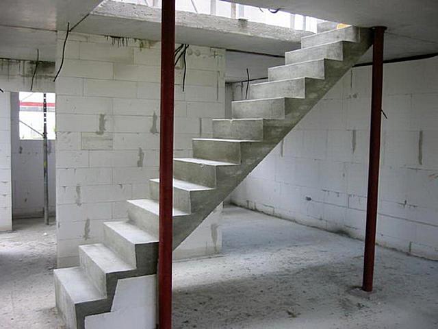 Les travaux commencent par la préparation d'une plate-forme de sable et de pierre concassée, où seront montés les escaliers. Ensuite, le coffrage est installé. Des éléments de renforcement sont posés le long de la marche et des parties transversales porteuses. Couler le mortier de béton à partir de la marche inférieure. Il est permis de retirer le coffrage après un délai d'au moins trois jours à compter de la fin du coulage.