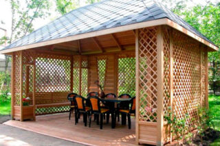- Lattis décoratif. Ces pièces de décoration sont souvent vendues avec des gazebos. L'autoproduction ne prendra pas beaucoup de temps. Il suffit d'acheter des lattes rabotées et de les abattre dans une structure d'orientation diagonale. Avec une simplicité extérieure, l'idée donne de nombreux avantages. La calandre bloque partiellement le vent et les précipitations, atténue la lumière du soleil.