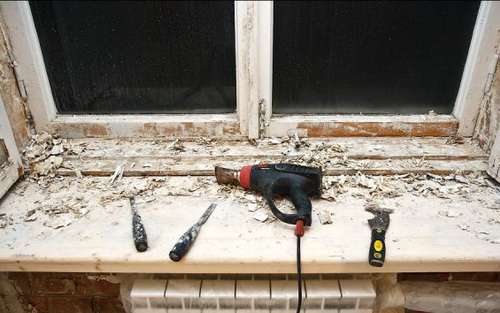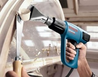 - Retirez l'ancien revêtement. Pour cela, plusieurs méthodes sont utilisées: la peinture est chauffée avec un sèche-cheveux de construction, nettoyée à la spatule et traitée avec un lavage spécial. Le décapage complet se fait à la brosse métallique ou au papier de verre.
