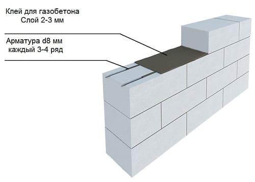 - Il est recommandé de renforcer les murs en béton cellulaire. Renforcez la rangée du bas, les fenêtres et les portes. Pour le renforcement dans les blocs, des rainures sont pré-percées et les tiges y sont posées lors de l'installation de la rangée.