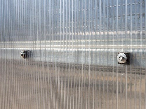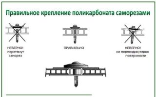 Pour la fixation du polycarbonate, du matériel d'un diamètre de 4,8 ou 5,5 mm est utilisé. Une vis autotaraudeuse de grand diamètre ne rentre pas dans le trou de la rondelle thermique.