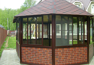 Si les propriétaires n'ont pas peur du froid ou si la structure est prévue pour être utilisée du printemps à l'automne, il vaut la peine de s'arrêter aux cadres en aluminium tubeless. Un gazebo avec des fenêtres du sol au plafond est une conception populaire et pratique en termes de fonctionnement. Ce bâtiment a l'air prétentieux et confortable à la fois.