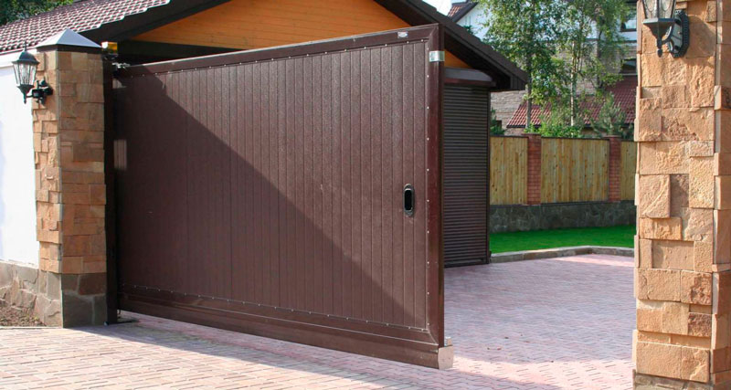 - Coulissant - le vantail de la porte est déplacé le long de la clôture sur le côté. Il n'est pas nécessaire d'ouvrir l'espace autour de l'ouverture, mais une section libre de la clôture est nécessaire.C'est beaucoup plus facile à faire, car selon les normes SNiP, même les buissons sont plantés à une distance d'au moins 1 m de la clôture. L'inconvénient de cette solution est la possibilité de gel du mécanisme à rouleaux et de contamination des guides. Ces articles doivent être nettoyés assez souvent.