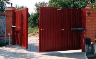 La norme d'un portail pour une maison de campagne prend en compte leur conception. Les dimensions de la ceinture battante ne sont limitées que par les capacités du matériau. Les portes métalliques montées sur des piliers en briques peuvent être très grandes.