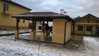 Cette option dans le gazebo est équipée d'une cheminée. Un vaste dôme d'échappement est installé au-dessus, une cheminée est en brique ou en tuyau.