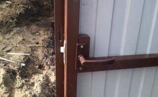 - Porte avec un guichet à l'intérieur. La hauteur du passage est standardisée - 2 mètres, les vantaux sont fixés dans le cadre de leur carré 20 x 40 mm. Le cadre des toiles est fixé aux poteaux d'une section de 60 x 60 mm. La rigidité est créée par des barres horizontales. Dans l'ouverture d'un battant de porte, un cadre pour le guichet est réalisé.