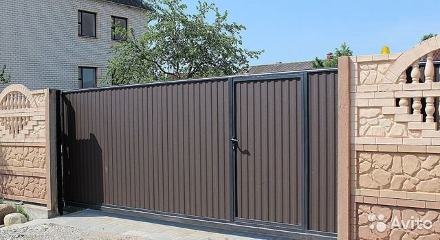 Les balançoires sont classés comme des options économiques bon marché, car la structure est facile à fabriquer, à installer et à utiliser. C'est une telle porte pour une clôture métallique qui est intégrée dans la porte, grâce à la combinaison, le nombre de poteaux de support est réduit. Les charnières sont soudées aux éléments verticaux, les auvents sont en polymère ou en métal.