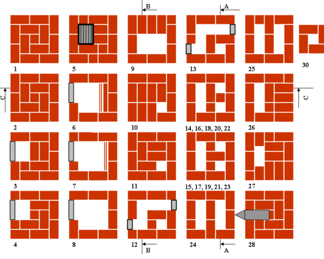- Lors de la maçonnerie, chaque rangée impaire est vérifiée par niveau pour s'assurer qu'elle est horizontale. Tous les 2-3 rangs, du fil est posé dans les coutures pour renforcer la structure.