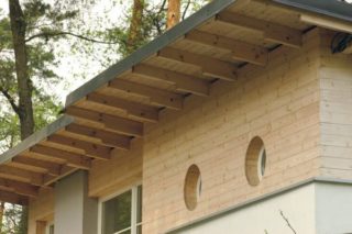 - Dans un bâtiment en bois, la corniche est fixée à des consoles. Pour la finition, prenez des planches à double chant.