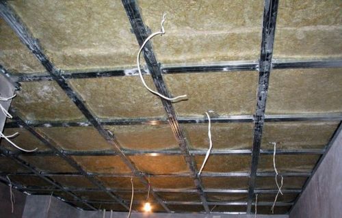 Des éléments CD sont montés dans les rainures. Avant de les installer, les cintres perforés sont fixés au plafond avec un pas de 1 m. Après avoir installé les composants du CD, les ailes des cintres doivent être pliées et renforcées avec de petites vis autotaraudeuses sur les bords.