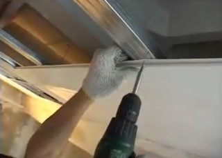 - Mesure et découpe du profil CD porteur. Installation des pièces dans les rainures, alignement et fixation à l'aide de vis autotaraudeuses avec un foret de 19 mm.