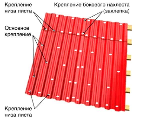 Le schéma d'installation, selon SNiP, est le même. Les feuilles sont montées avec un chevauchement, l'étape de fixation est déterminée par la charge attendue. Le rivetage sera effectué d'un côté à l'endroit de la fixation.