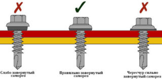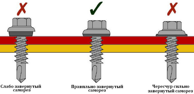 La quincaillerie avec une extrémité pointue ne perce pas, mais traverse le métal. Les fixations nécessiteront plus de force, ce qui entraîne généralement des dommages matériels. Un tournevis classique sans rondelle d'étanchéité ne convient pas non plus : avec une fixation rigide, la possibilité de compenser la dilatation thermique du matériau disparaît, la toiture se déforme et se fissure.