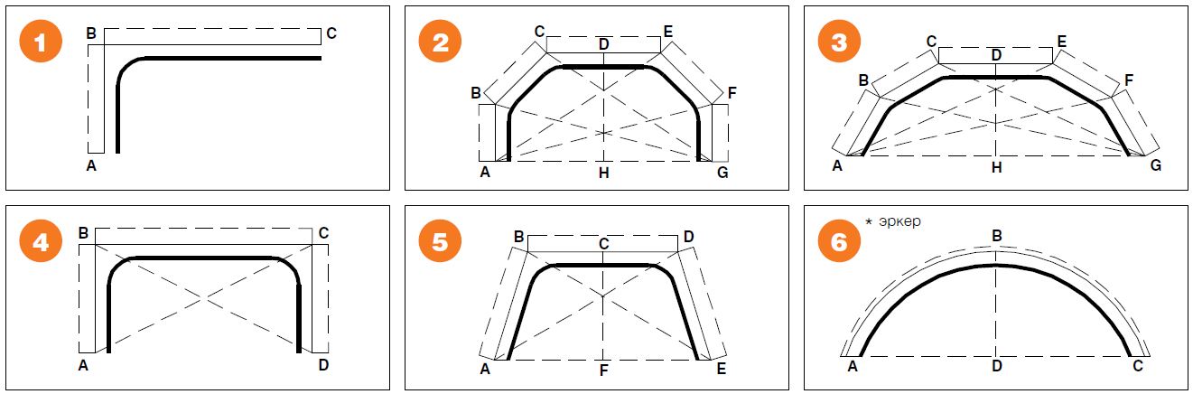 Par forme, ils distinguent les structures semi-circulaires, rectangulaires, trapézoïdales, triangulaires et à multiples facettes - le choix est basé sur les tâches et la conception des façades.