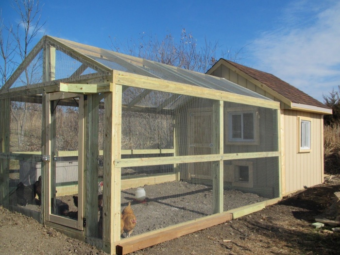 Près du poulailler, vous pouvez équiper une cour de promenade de 2x2 m, clôturée avec un treillis métallique de haute qualité. Une porte séparée du bâtiment lui-même devrait y conduire. Un hangar est organisé au-dessus de la cour, et des perchoirs sont montés sur son territoire. Pour protéger les poules des prédateurs, le filet de clôture est creusé au moins jusqu'à la profondeur de la baïonnette de la pelle. À proximité, vous devez installer des pierres ou des briques autour du périmètre.