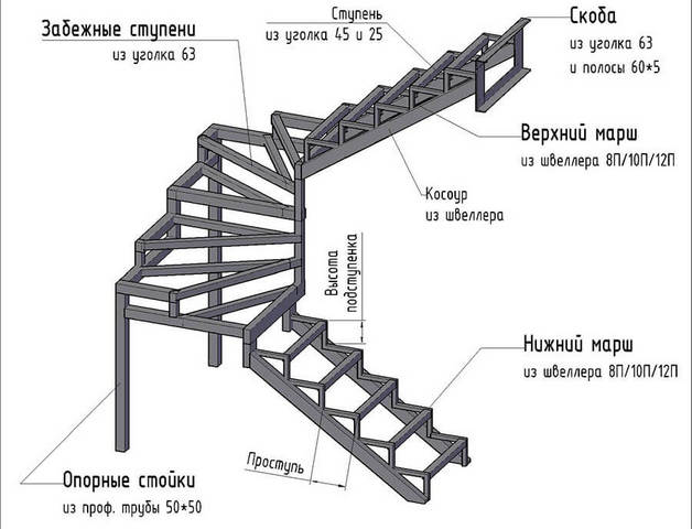 Les paramètres de profil pour les escaliers sur une structure métallique dépendent des indicateurs suivants: