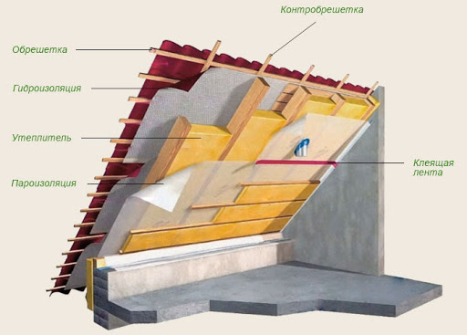 Entre les chevrons, une isolation thermique est posée et fixée. Les interstices sont scellés avec de la mousse de polyuréthane. Fixez une couche pare-vapeur. Montez le classeur.