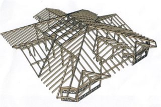 - création d'une charpente à chevrons avec piliers centraux et barre faîtière, pose avec fixation ;
