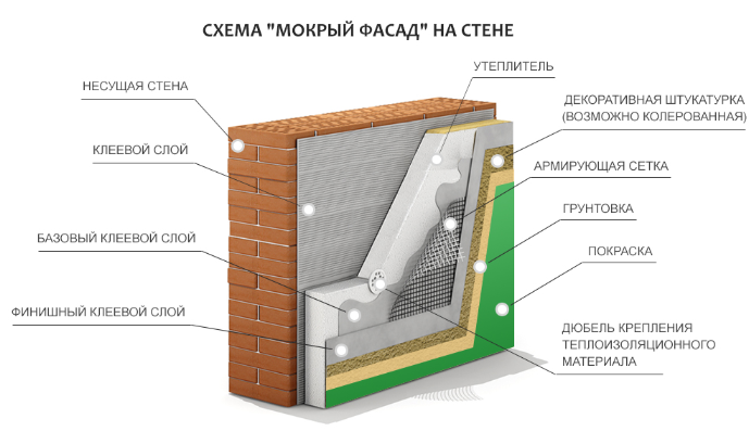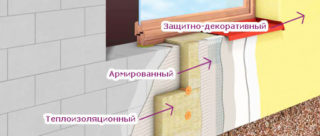 La particularité de la façade est un grand nombre de couches. Chacun d'eux a sa propre signification : il isole, protège, ajoute un effet décoratif. Pour que la structure remplisse au mieux ses fonctions, des matériaux de haute qualité sont utilisés.